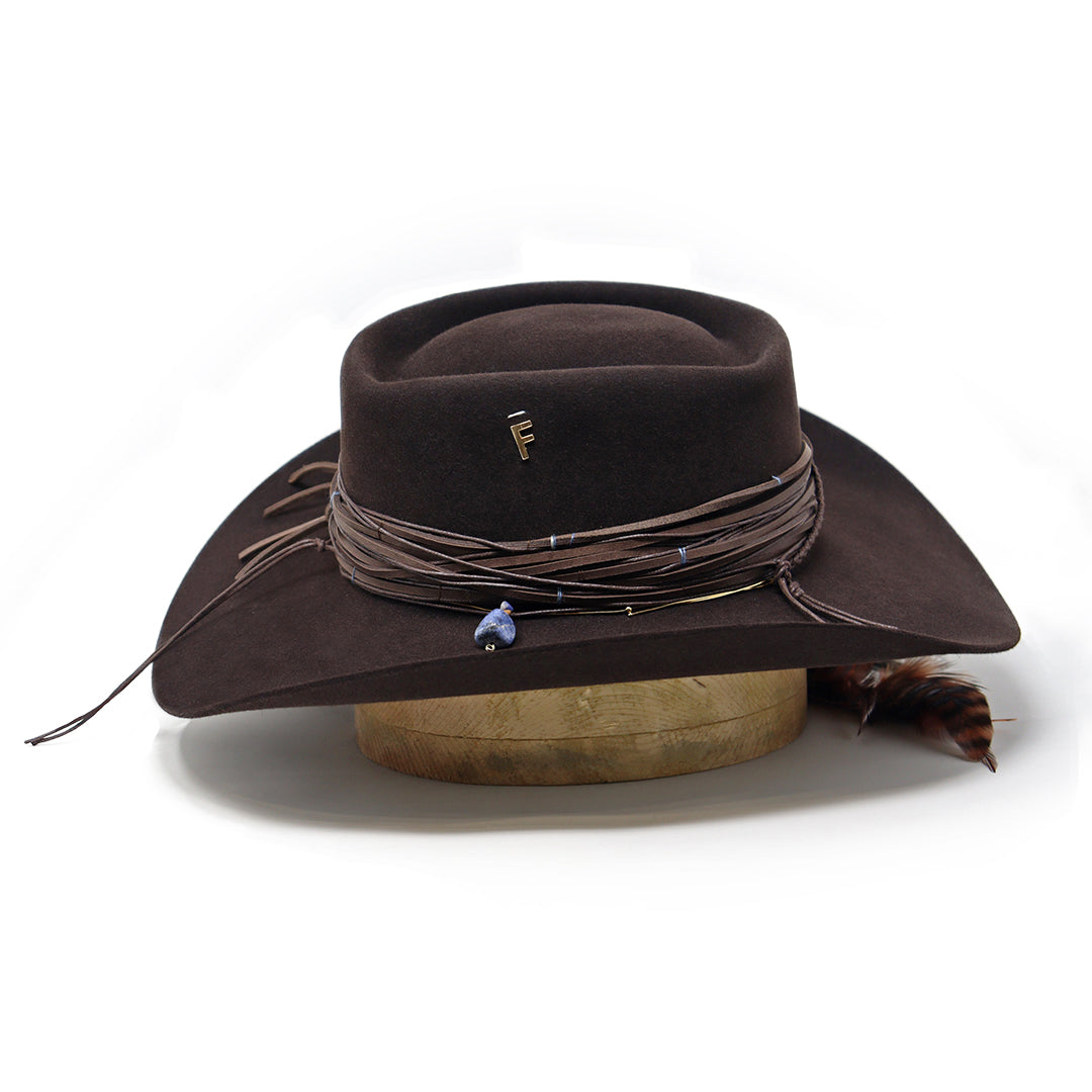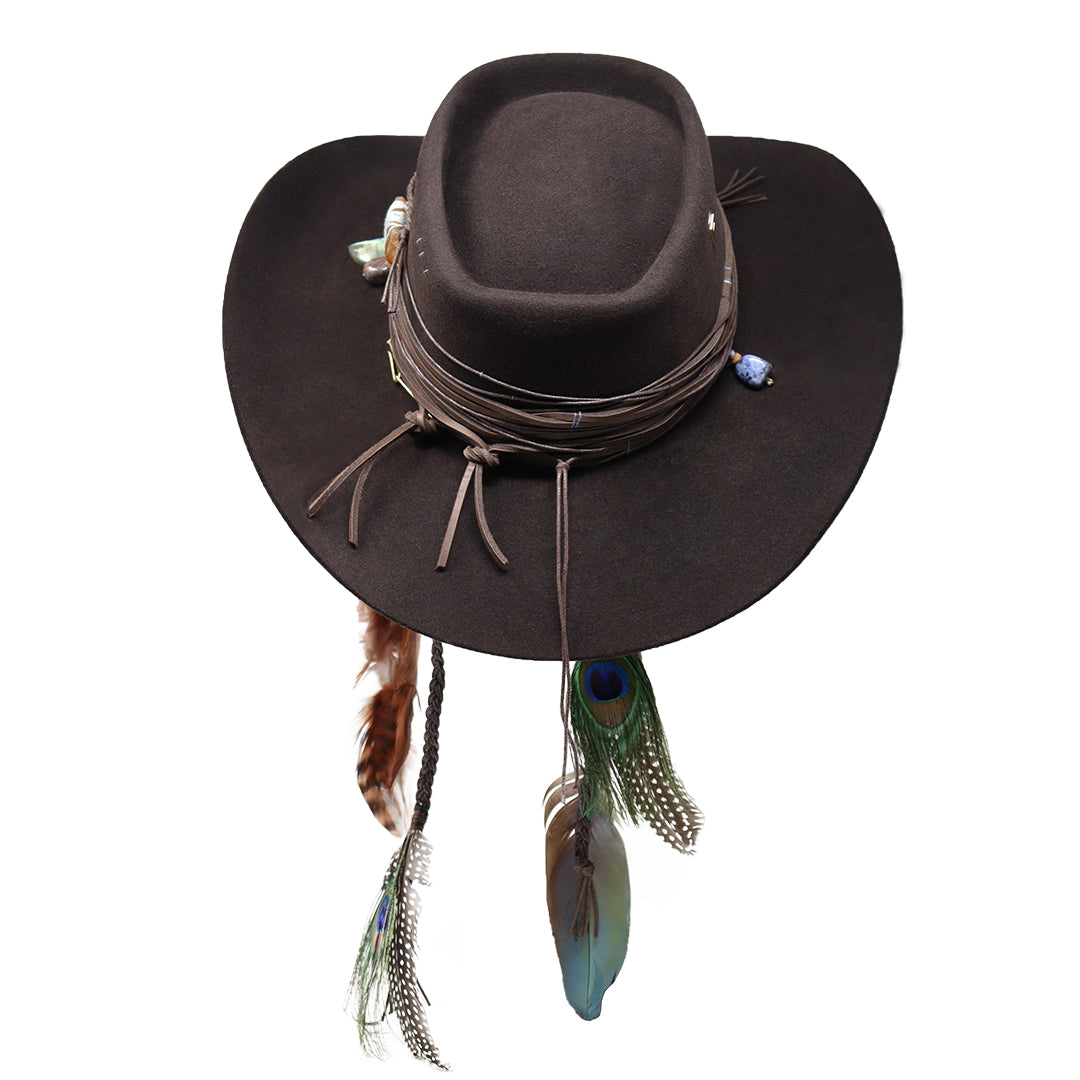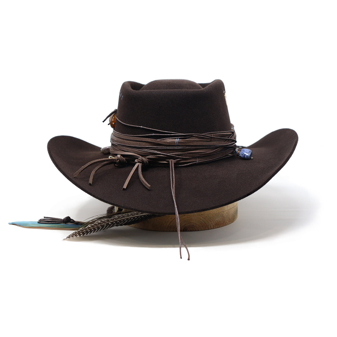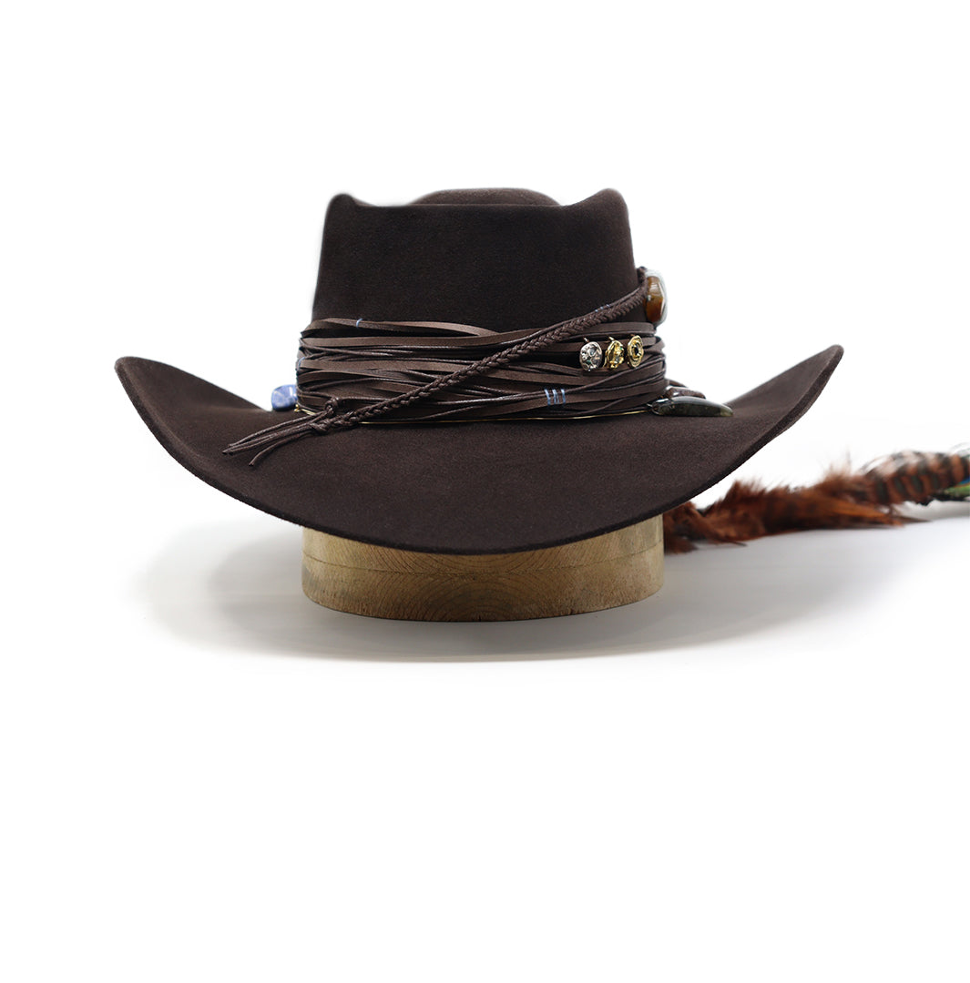 Introducing the "Luisa Ferne Handcrafted Hat" – a testament to artisanal excellence in ethically sourced beaver fur felt. Crafted from 100% ethically harvested materials, this hat boasts a rich brown hue, a 9 cm (3.5 inches) brim, and an impressive 11 cm (4.3 inches) crown height. Its design is a harmonious blend of genuine brown leather straps, an adjustable handmade gold-plated necklace, and the exquisite "Elementos" Collection, adorned with naturally formed quartz. Completing the look are waxed cotton brown braids and delicate pheasant and grizzly rooster feathers, evoking a sense of freedom.