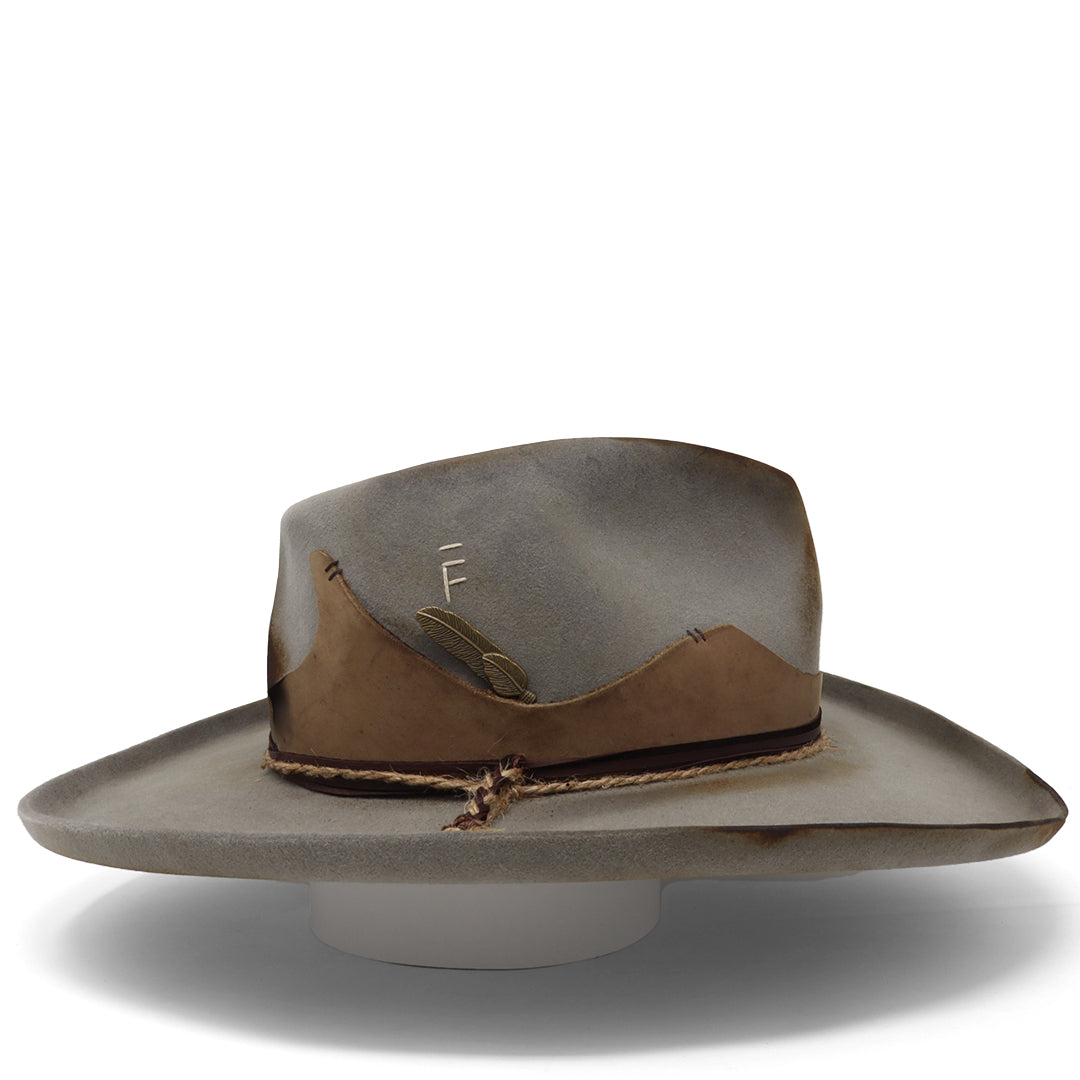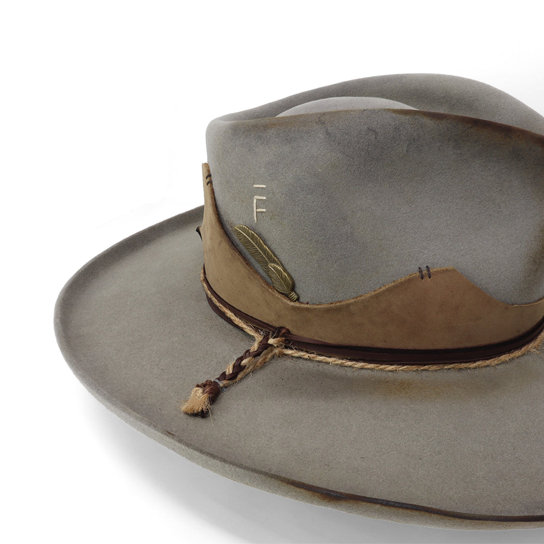 Design description: The crown of the hat has two folds at the back. On the side, an asymmetrical lamb skin cut with a metallic feather. Leather and jute ropes are on the hat waist and has a natural quartz in sand tones detail.