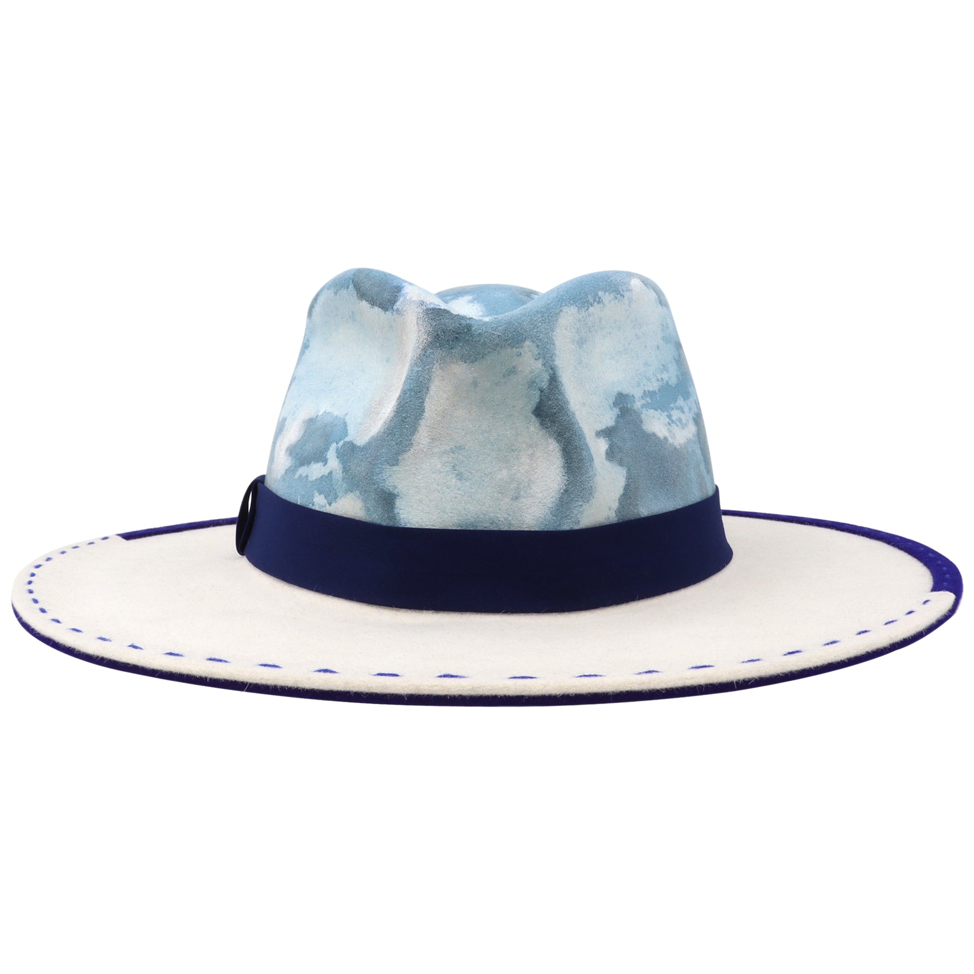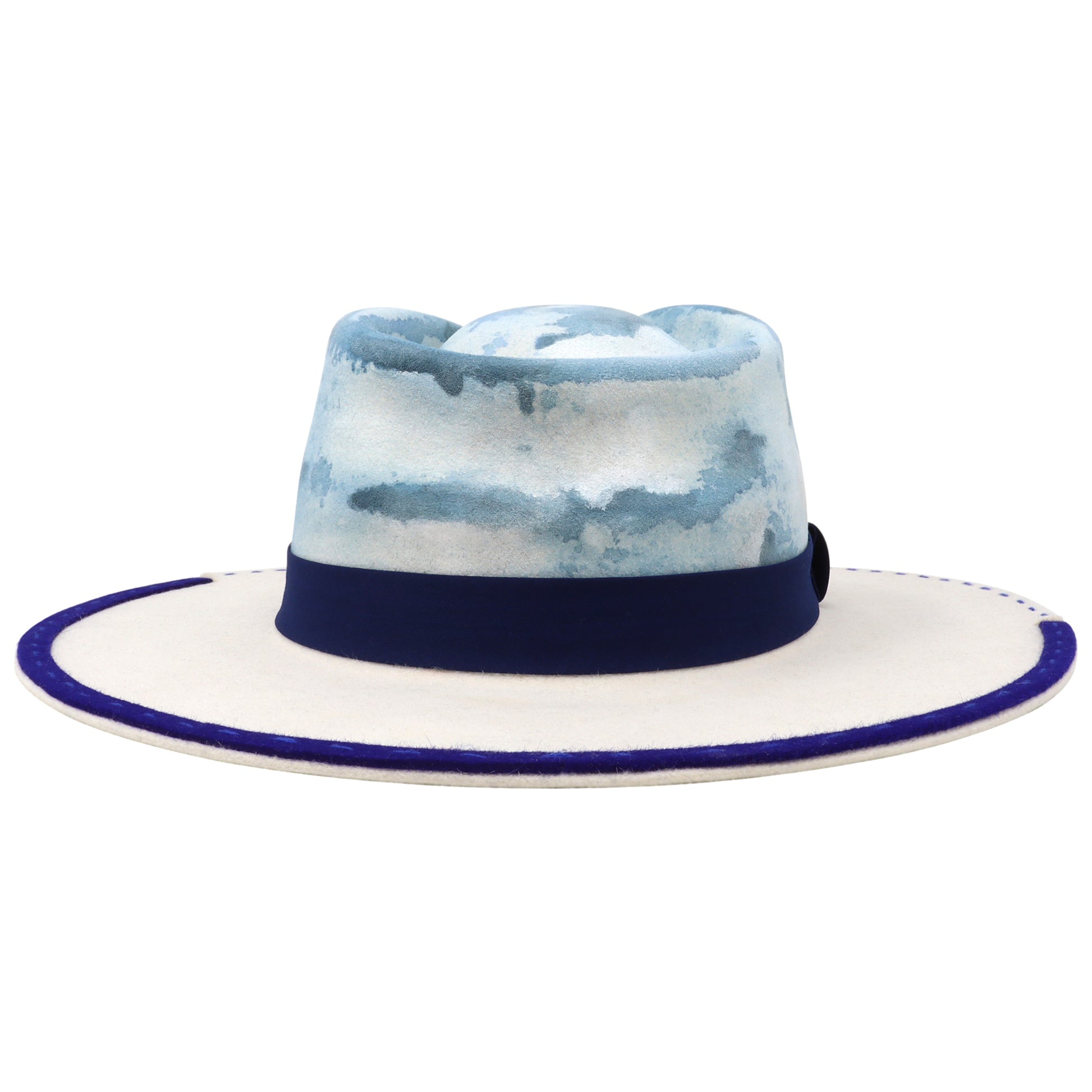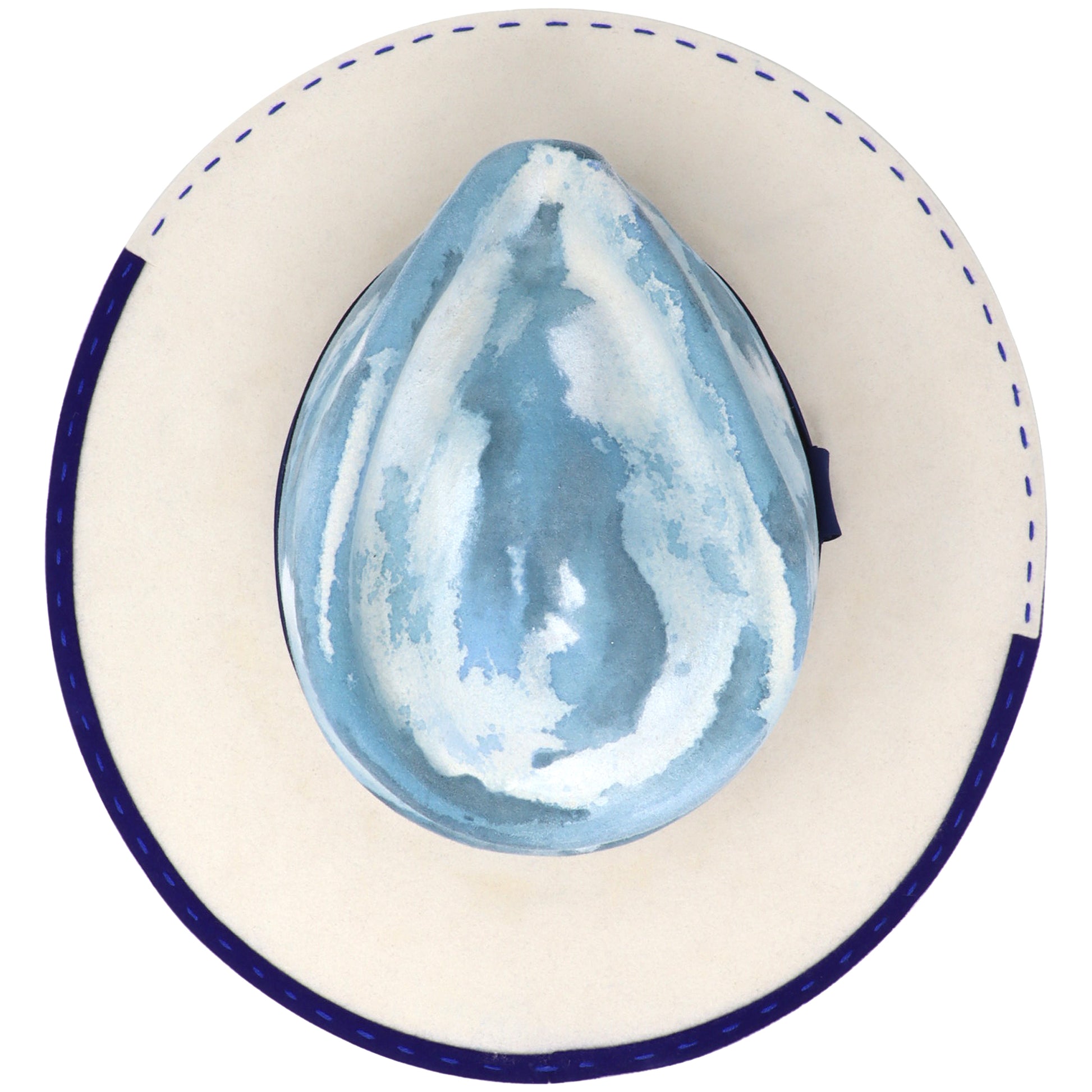 Este increible sombrero artesanal está pintado a mano en un acabado estilo tie day en tonos azul-turquesa y adornado con una banda azul rey. Destaca su borde doble y alternado en azul, con costuras de adorno del mismo tono.