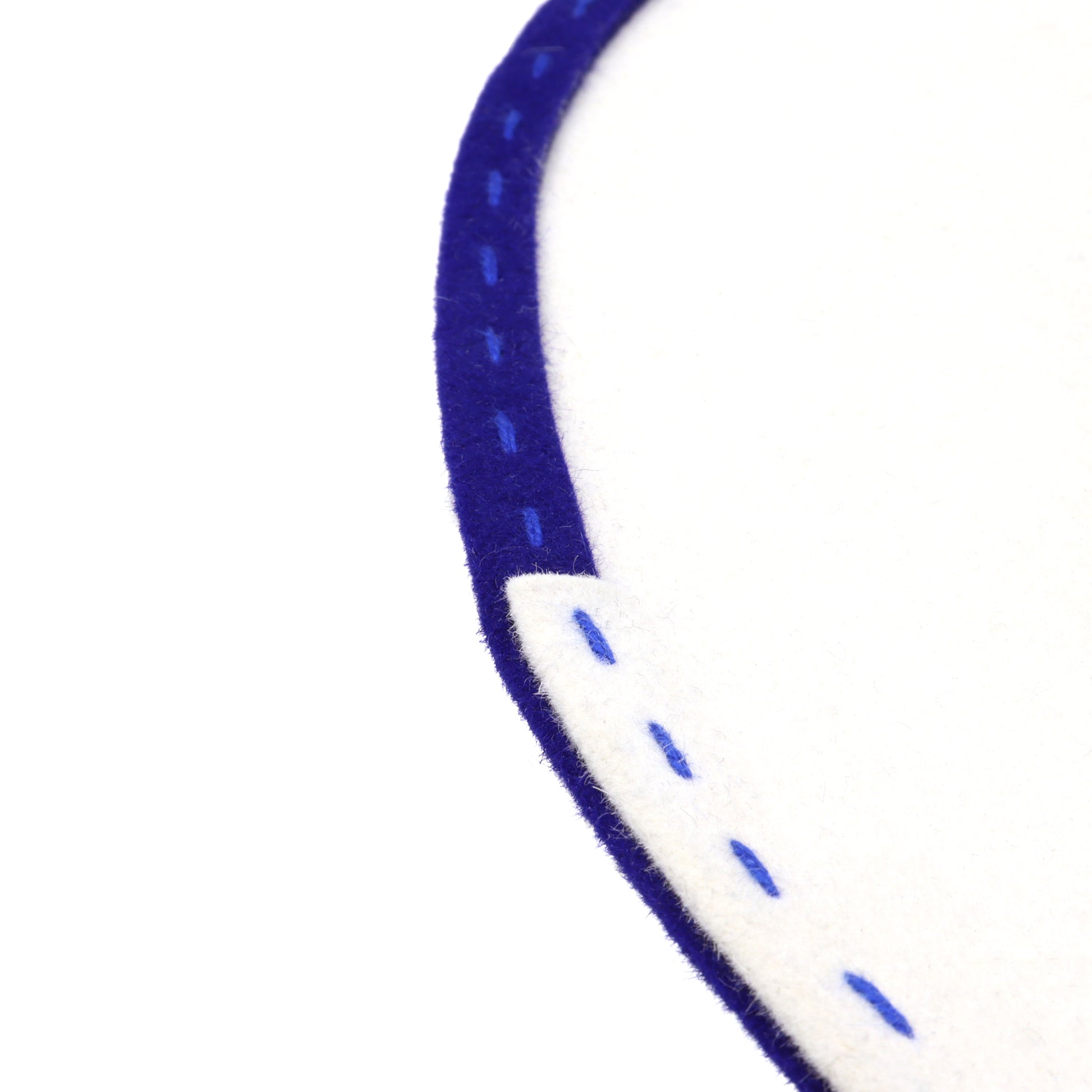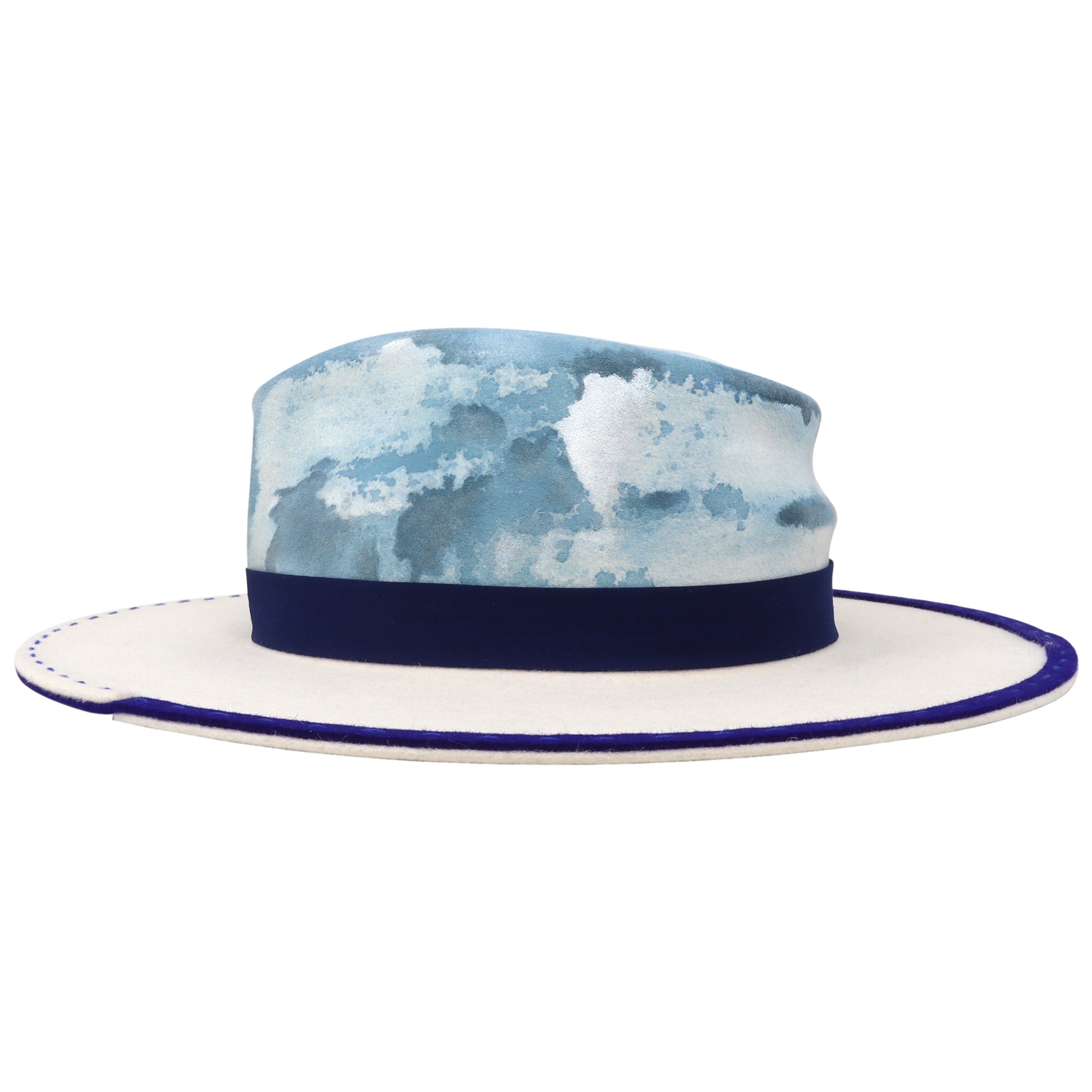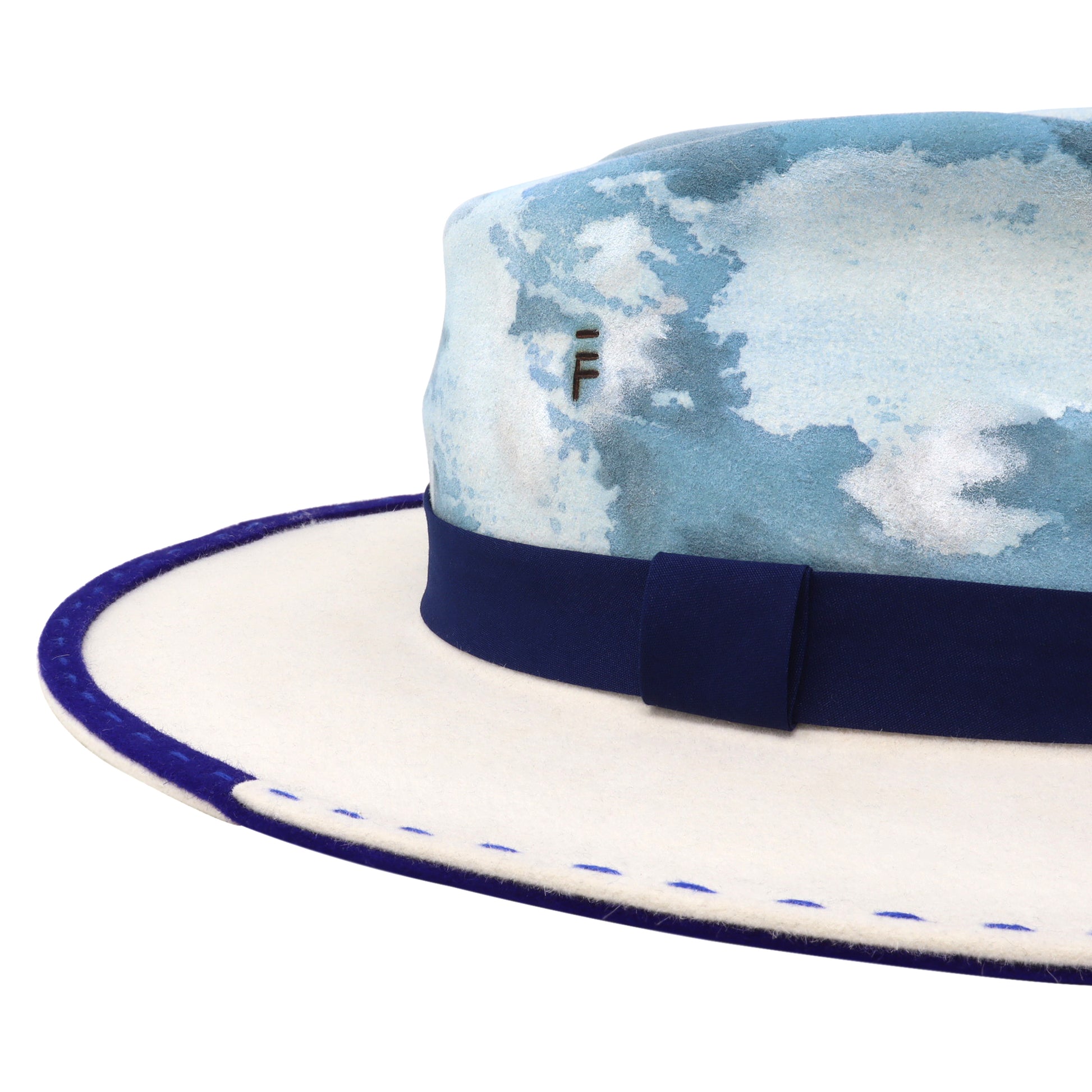 Este increible sombrero artesanal está pintado a mano en un acabado estilo tie day en tonos azul-turquesa y adornado con una banda azul rey. Destaca su borde doble y alternado en azul, con costuras de adorno del mismo tono.