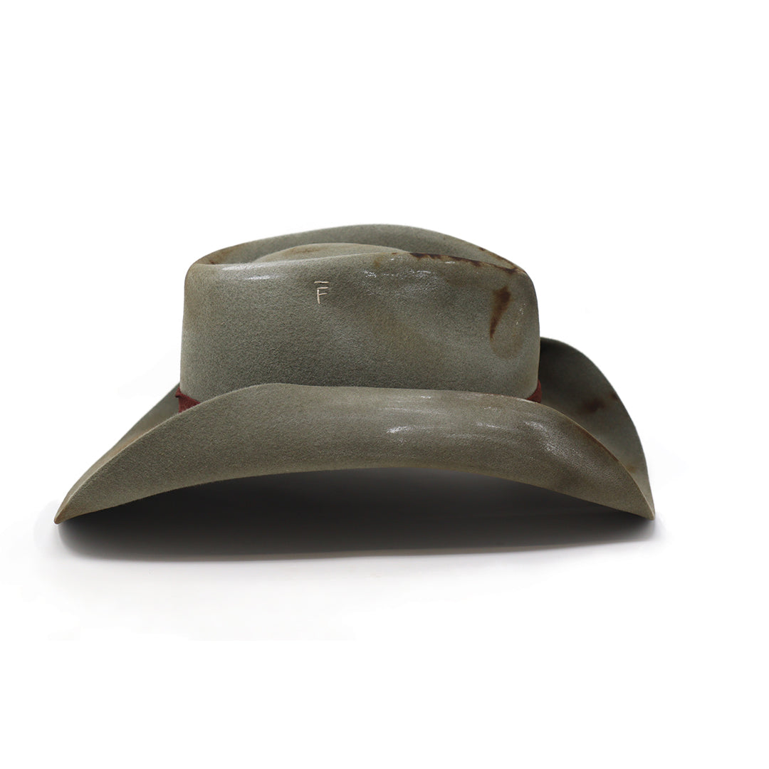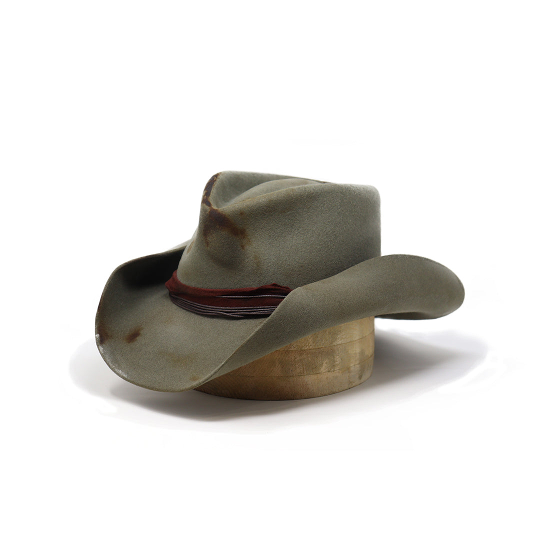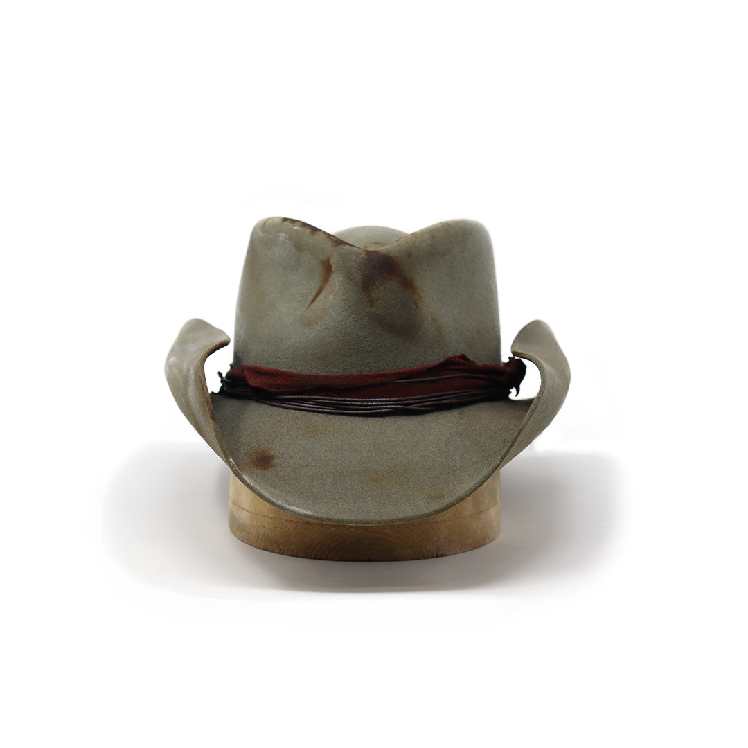 Design description: Slightly burnt handcrafted hat, faded effect with paint, leather ribbons and hatband.